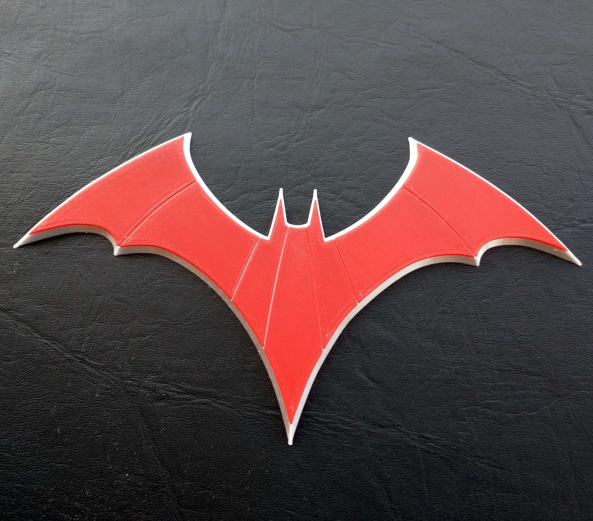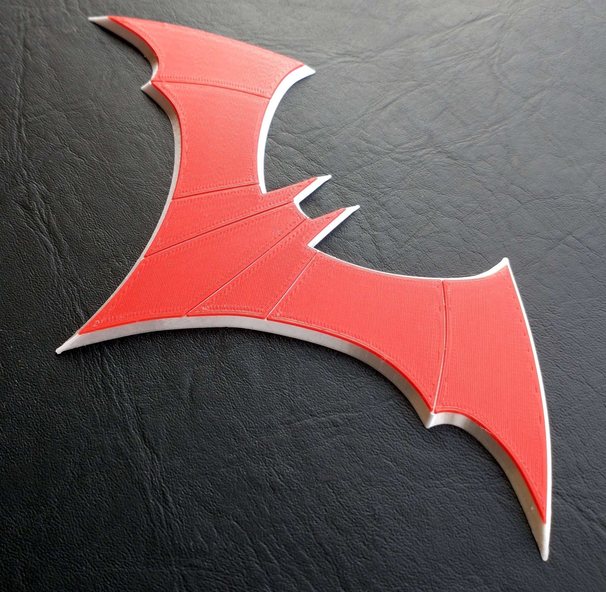 Here is the Batwoman batarang. 7" from edge to edge. Made out of printed PLA red and silk silver. It is a prop and is not meant for actual use. the points can be sharp.