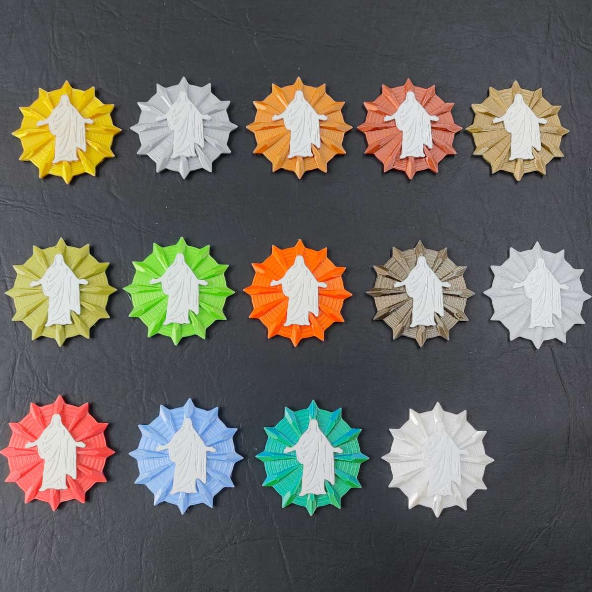 Here is the Savior on a shiny colored background that looks like rays coming out of the sun. They shine and reflect the lights from different angles.