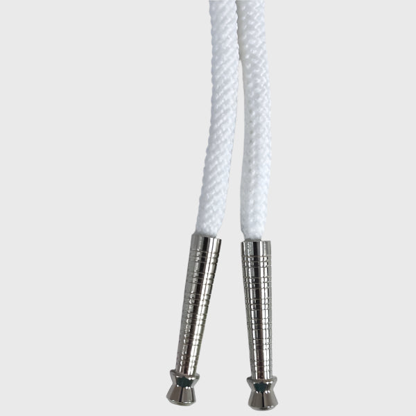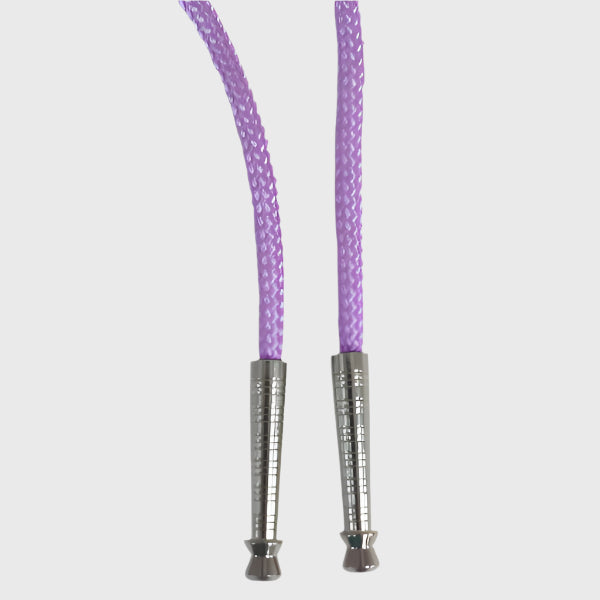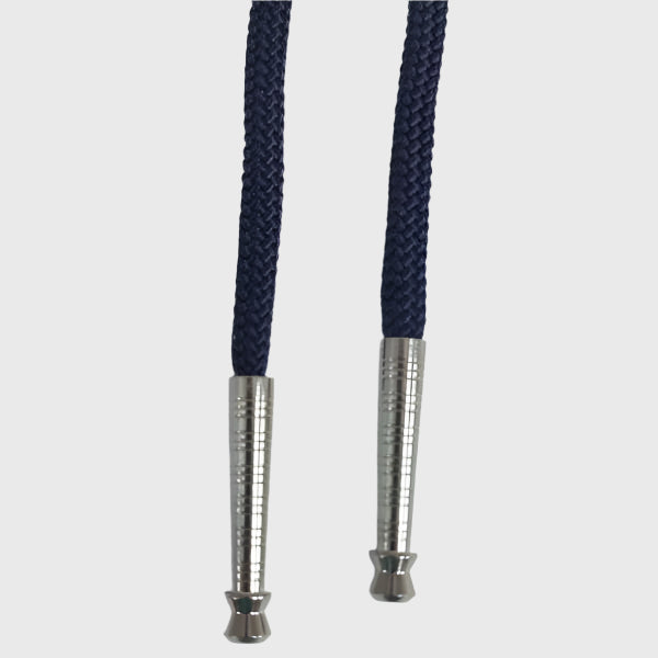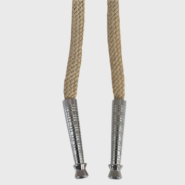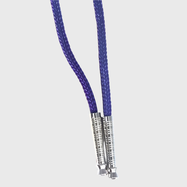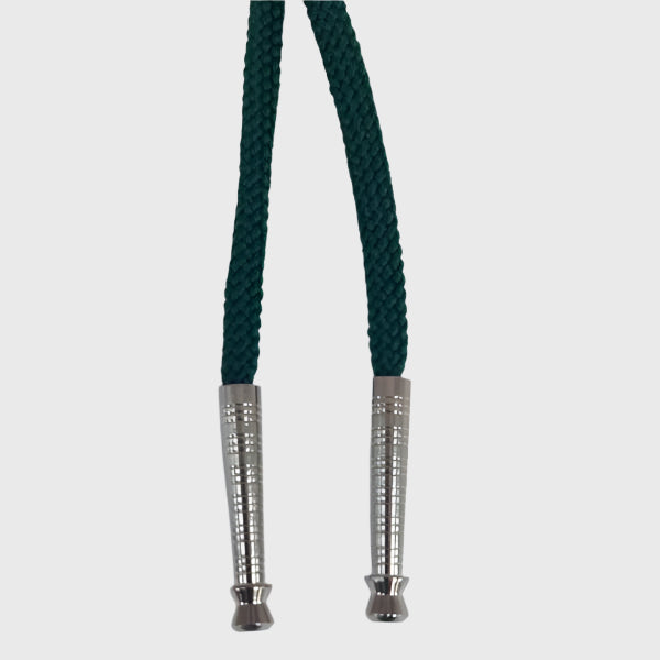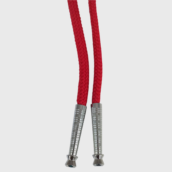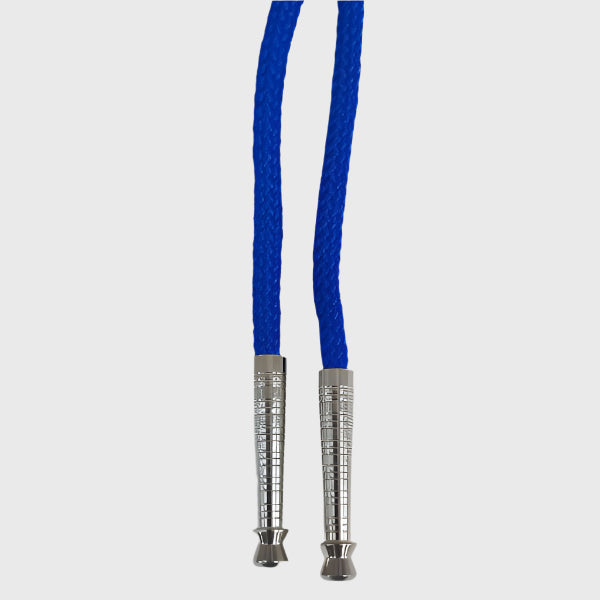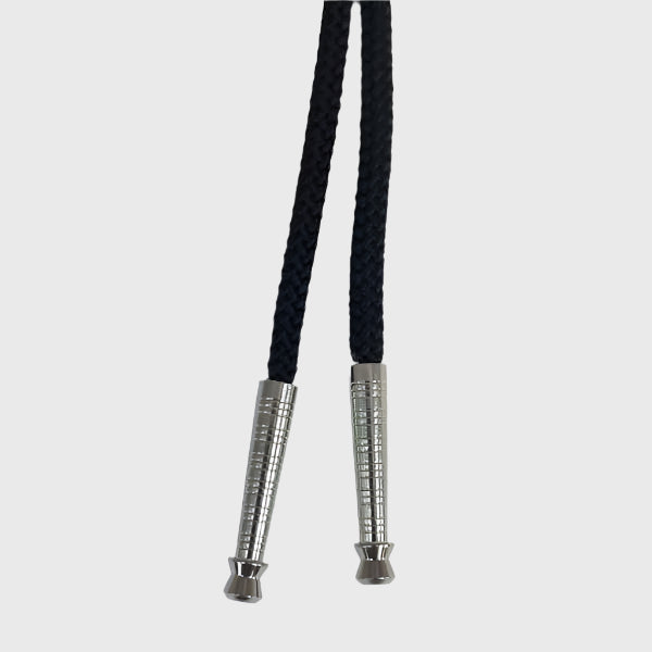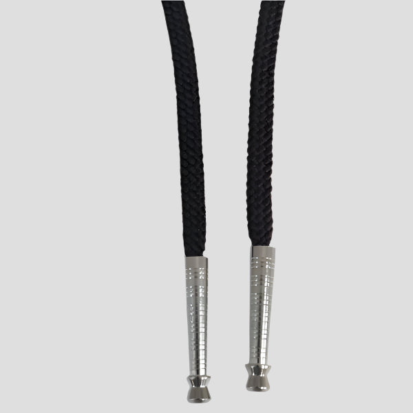 These 36" Rayon cord bolo neckties come with a great slide on the cord that has a button on the back to press when sliding it. They hold strong without slipping. The neodymium magnets are fixed in place and will hold securely. The ends have silver metal tips.