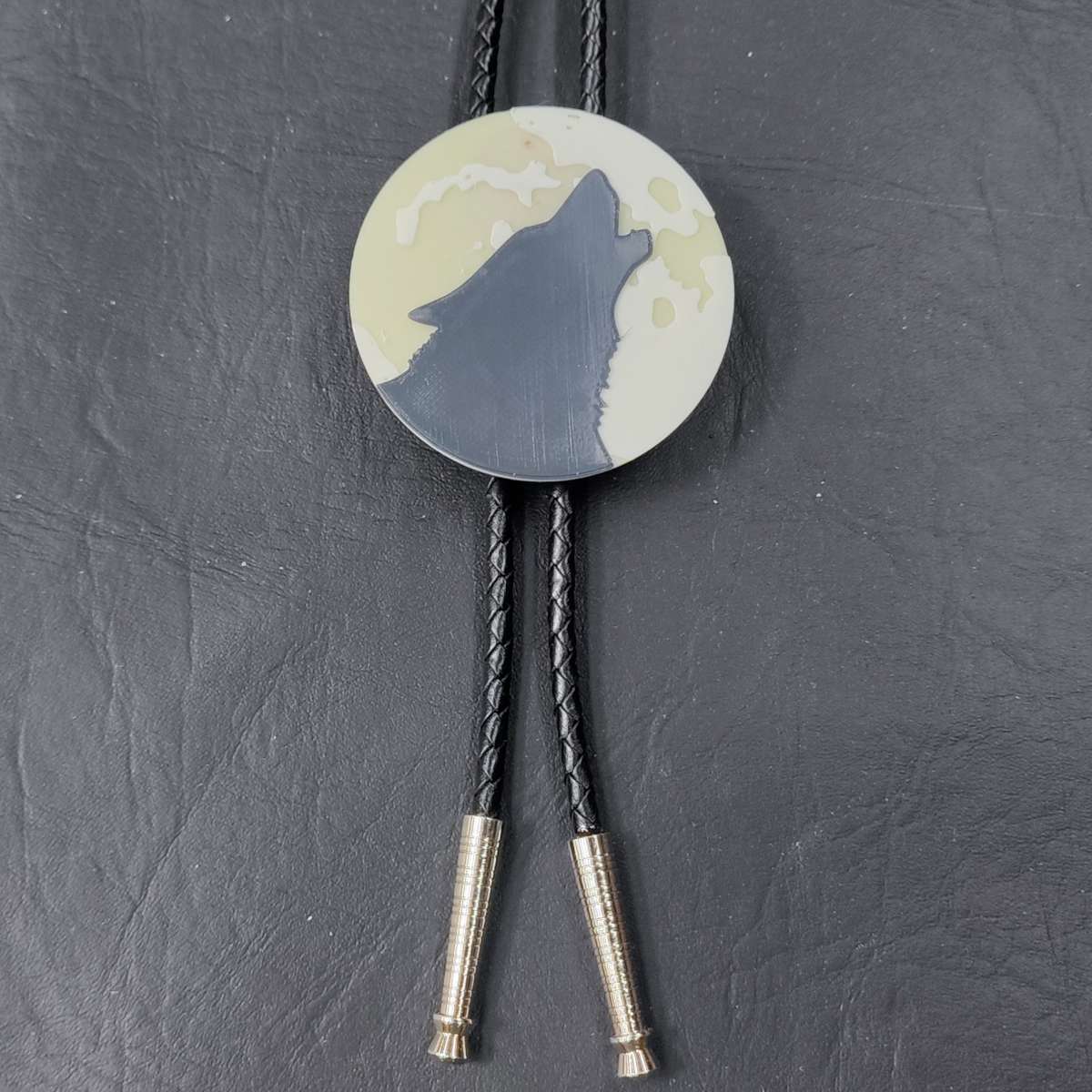 Two Wolf bolo Heads dark gray on an ivory colored back.