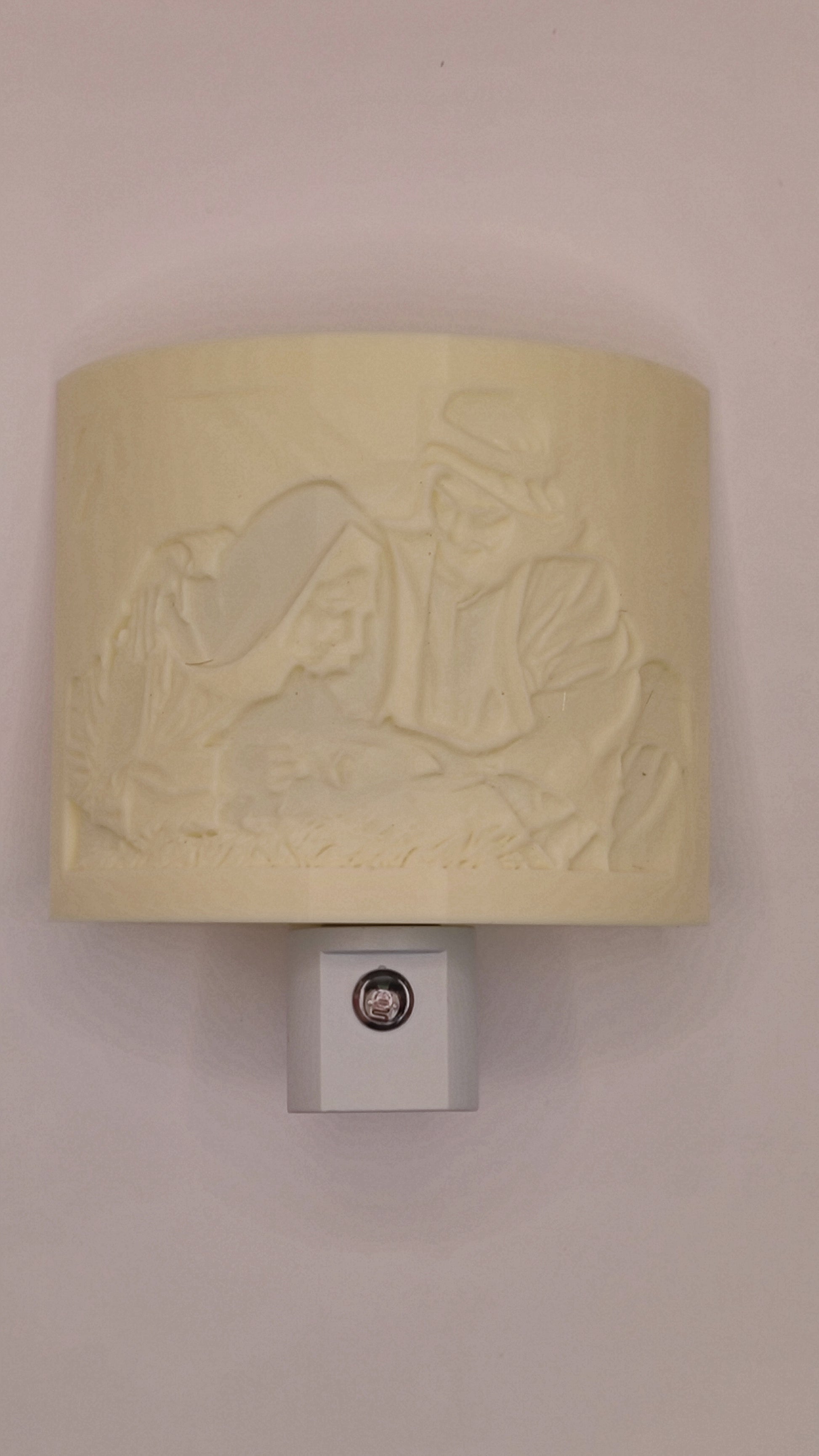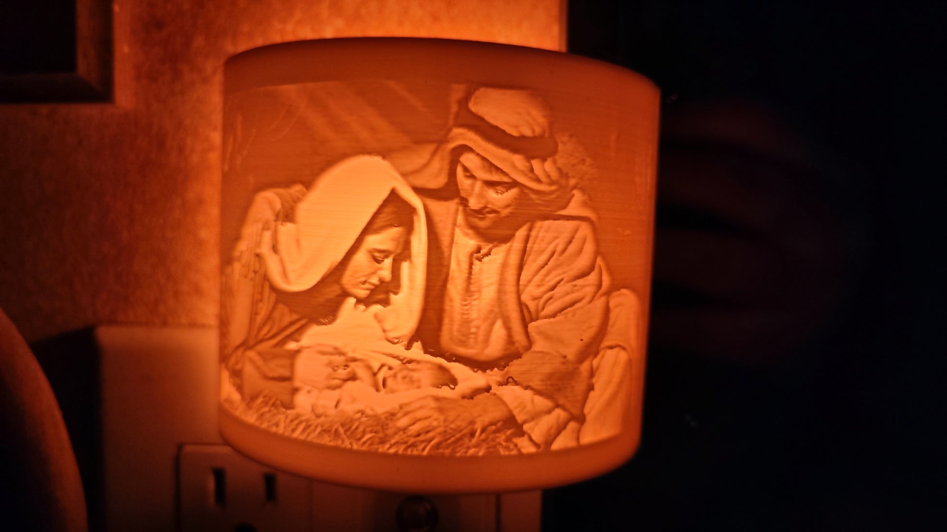 3D printed Nativity that slides onto night light. The night light is also included. It has a light sensor so that when the lights are on the night light is off.