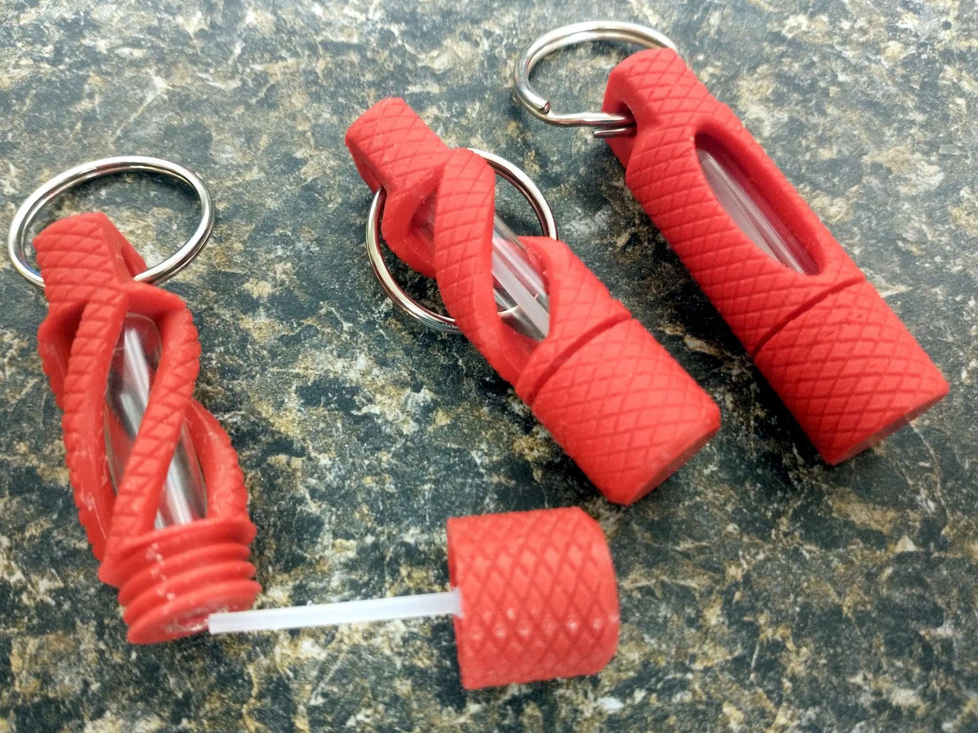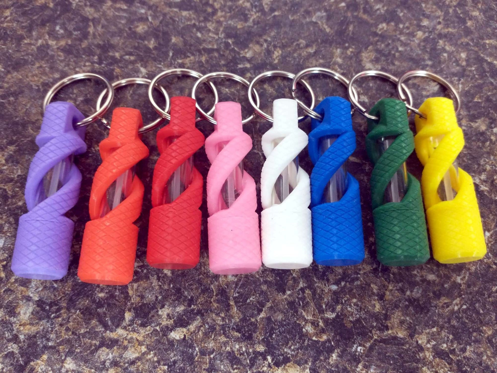 3D printed oil vial. Printed out of plastic encasing a glass vial. Used to store oils to have on hand wherever you find yourself. Consecrated olive oil to essential oils work in this keychain.