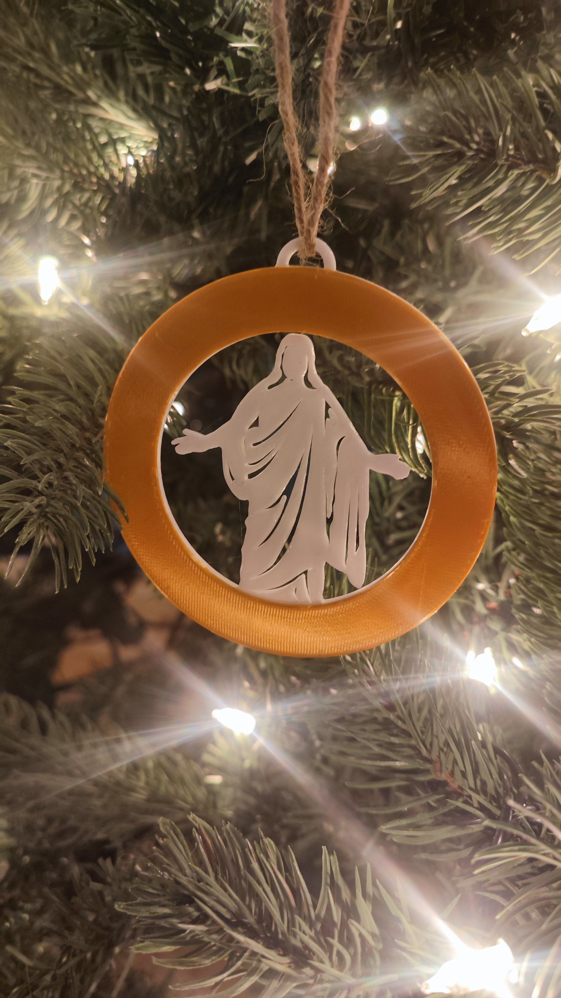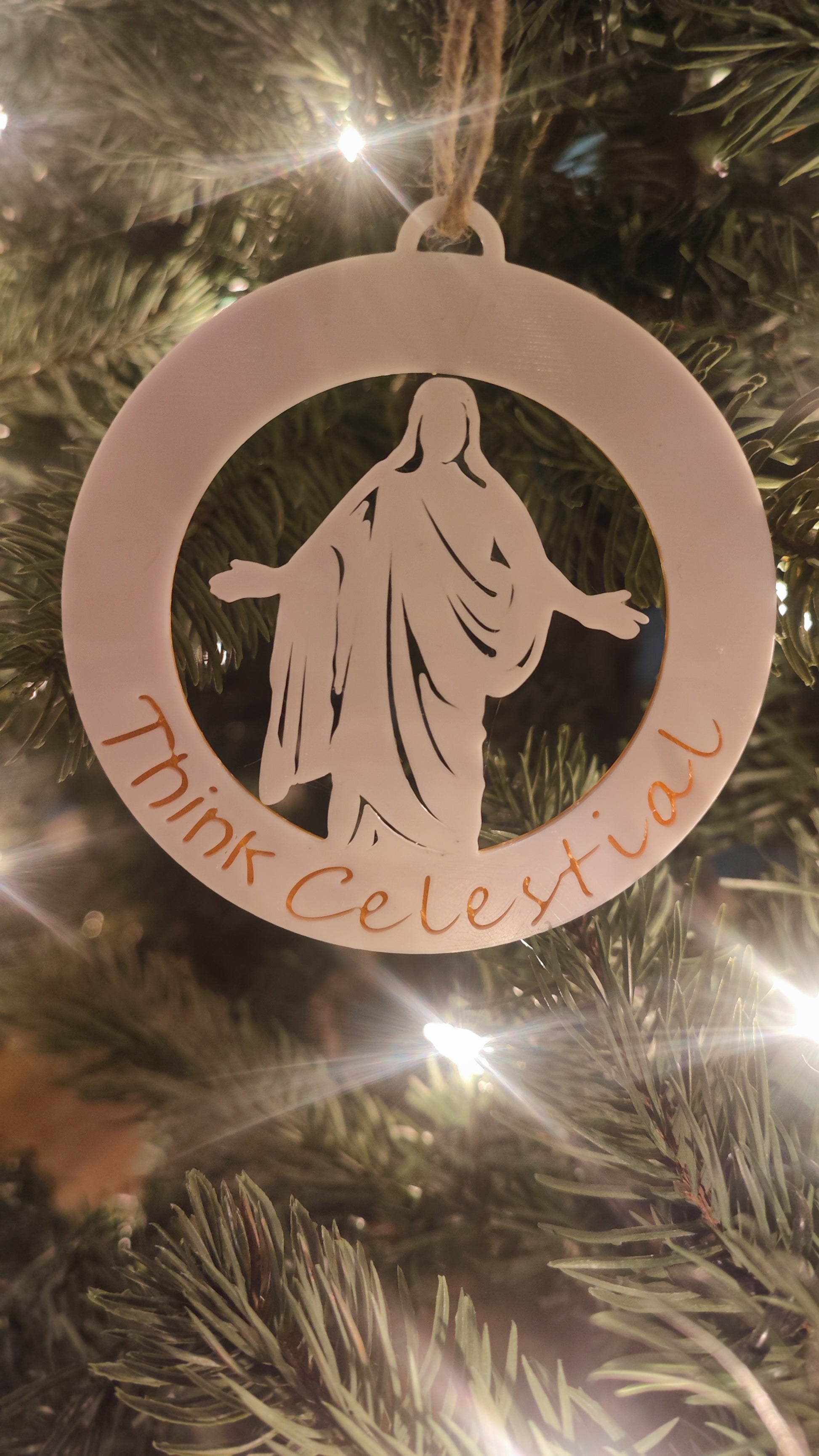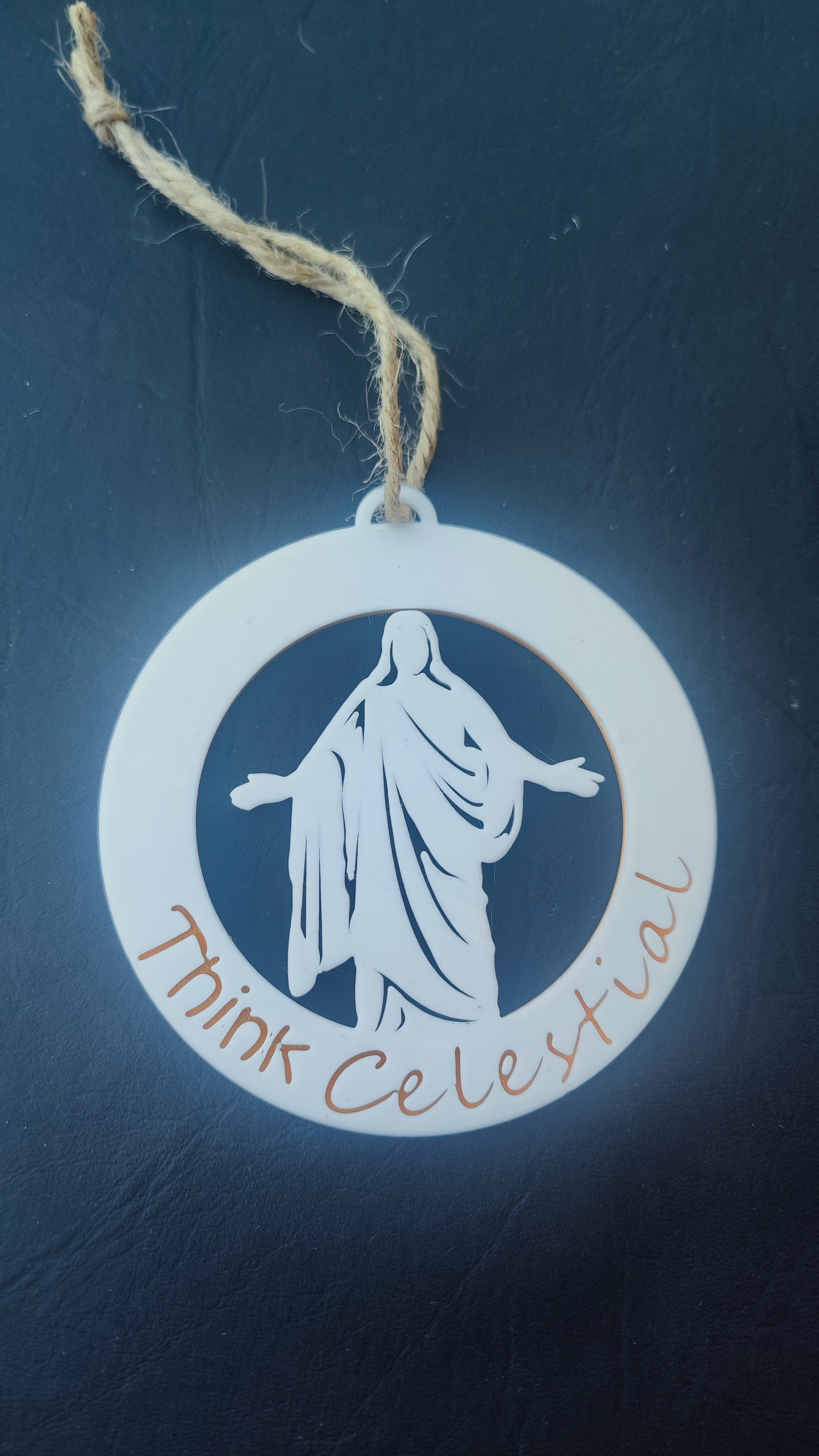 3D printed Ornament has a reflective color on the front and white on the back. The words Think Celestial can clearly be read from the back side. Comes with a piece of Jute rope for hanging, or can be replaced with ribbon of your choice. About 3 inches in diameter.
