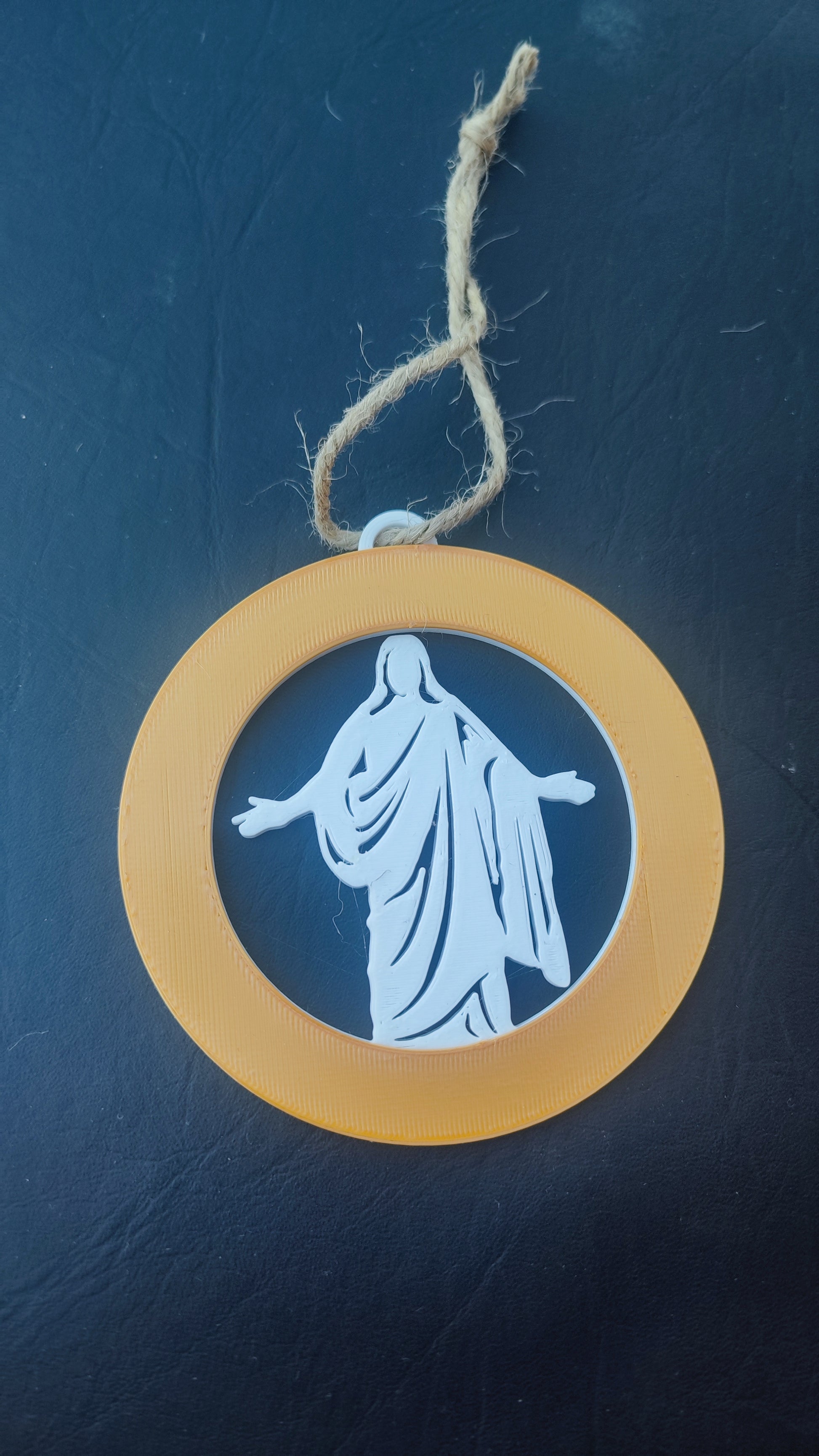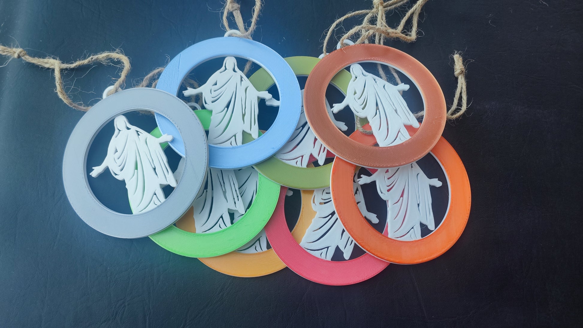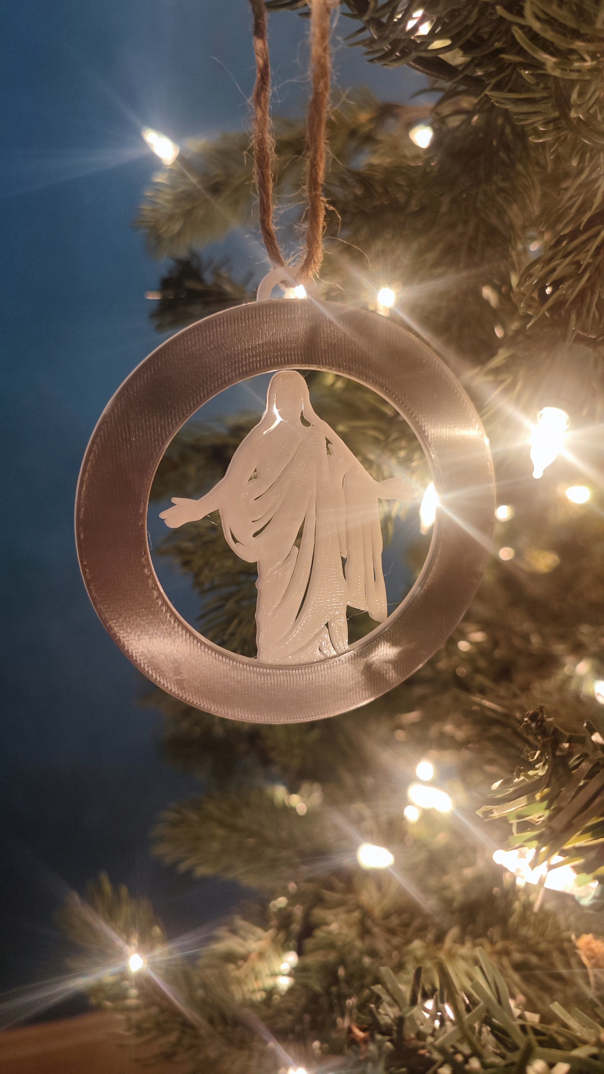 3D printed Ornament has a reflective color on the front and white on the back. The words Think Celestial can clearly be read from the back side. Comes with a piece of Jute rope for hanging, or can be replaced with ribbon of your choice. About 3 inches in diameter.