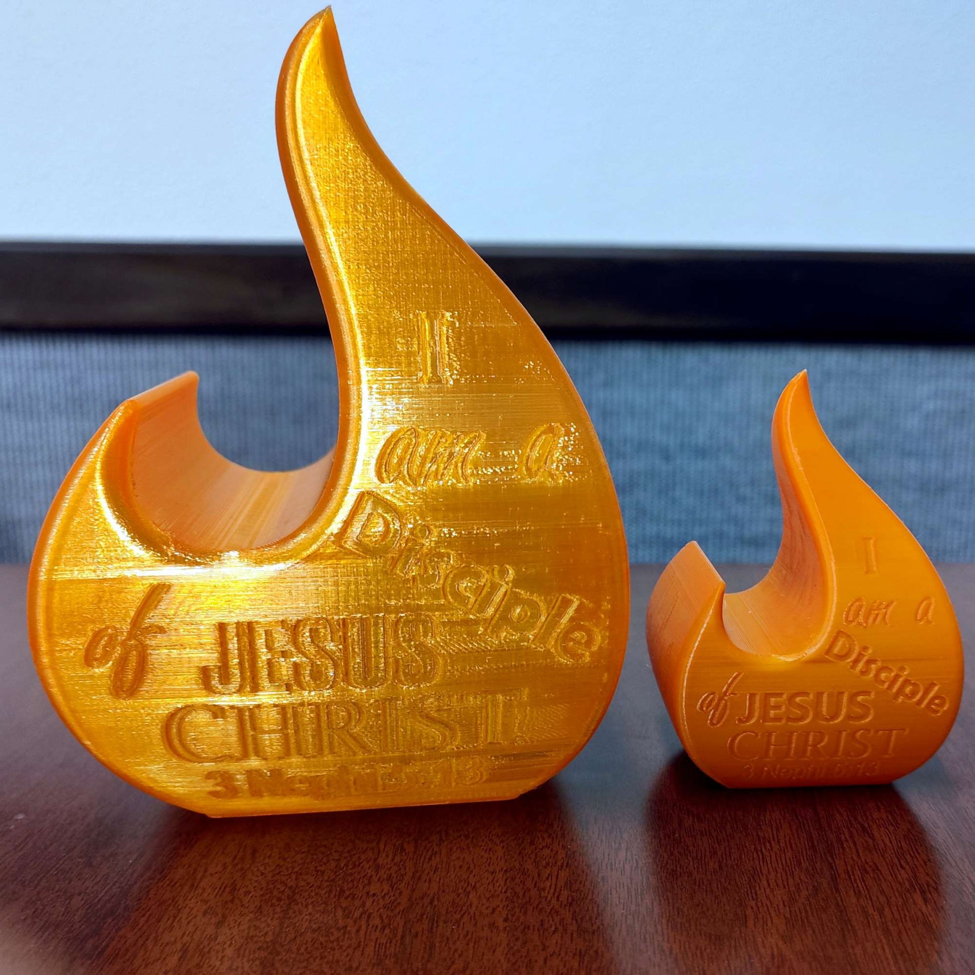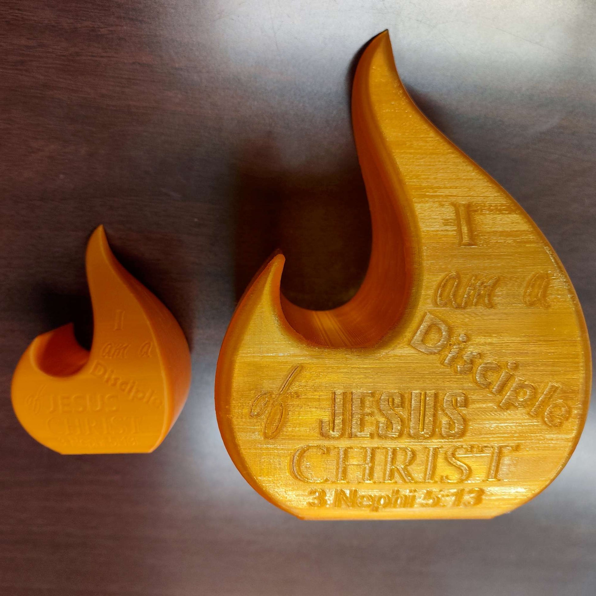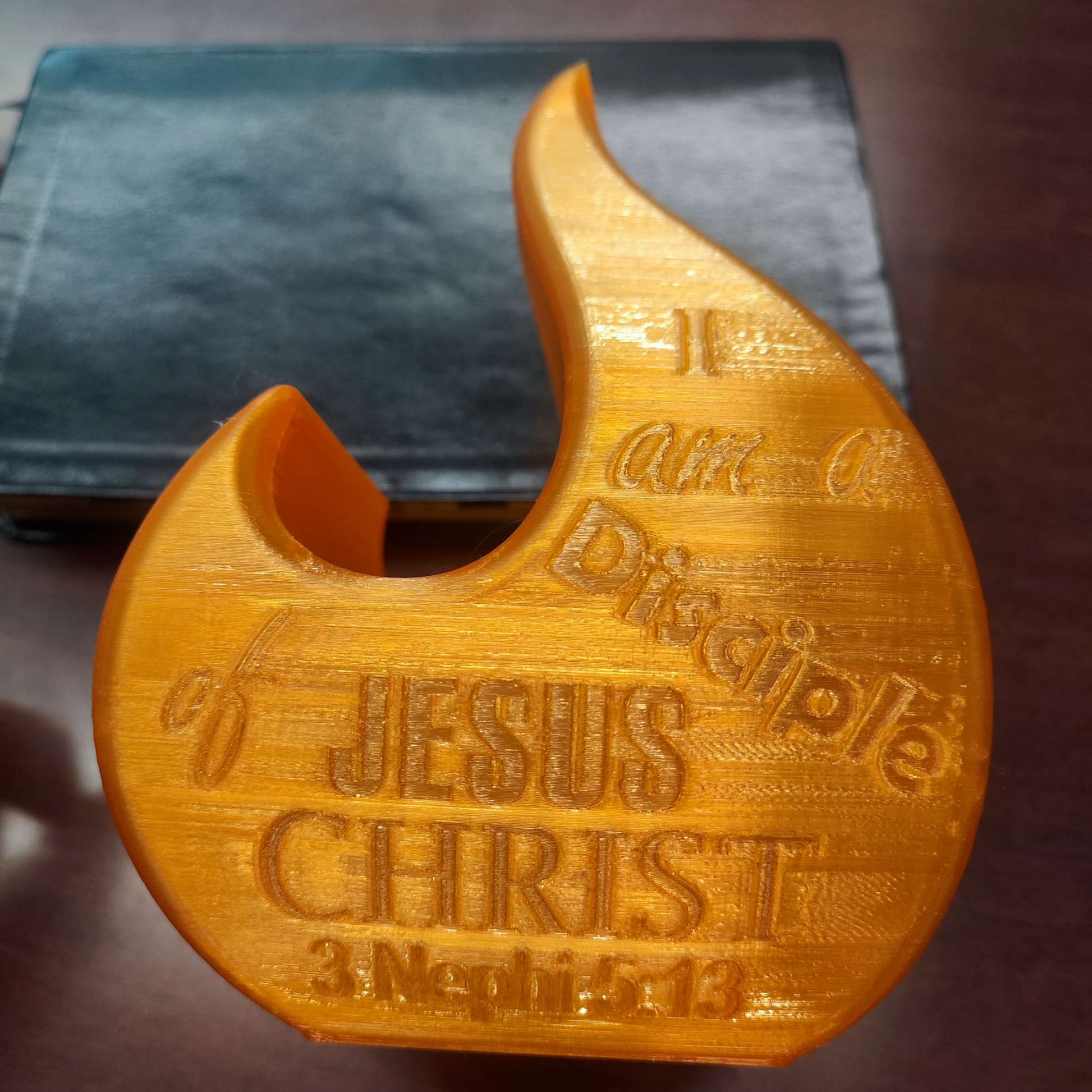 I created a flame that is hollow for a small tea light to fit inside. It glows showing flames and the inscription "I am a Disciple of Jesus Christ"